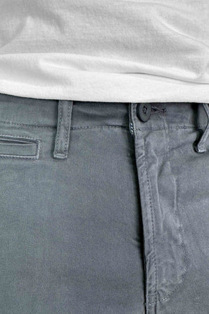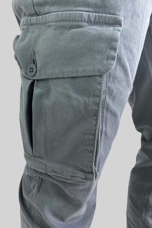 Dos bolsillos delanteros. Bolsillo de carga en cada muslo. Dos bolsillos traseros con botón.
